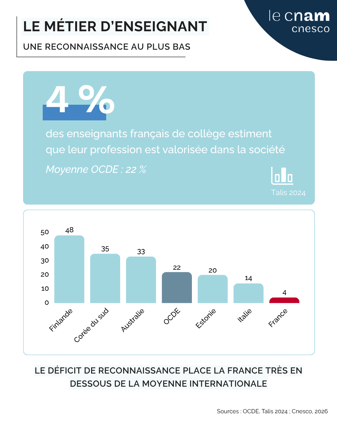 Un visuel sur le déficit de reconnaissance sociale du métier enseignant en France.