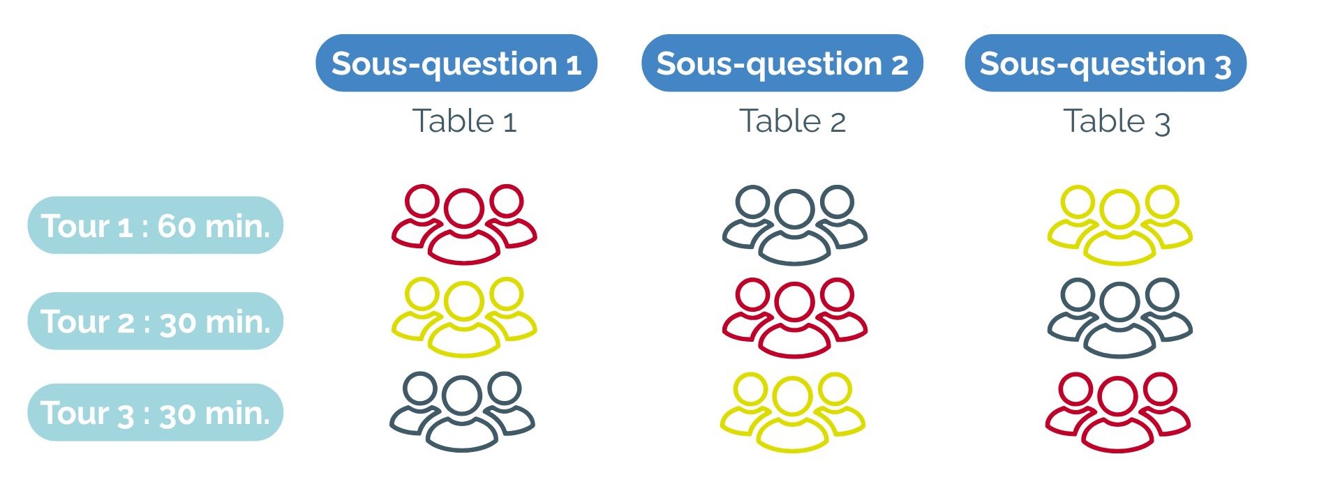 Pour favoriser les échanges, les participants se répartissent en trois sous-groupes autour de tables, chacun travaillant sur une sous-question. À intervalles réguliers, les groupes changent de table, tandis qu’une personne reste pour faire le lien et restituer les discussions précédentes. Cette organisation favorise :
